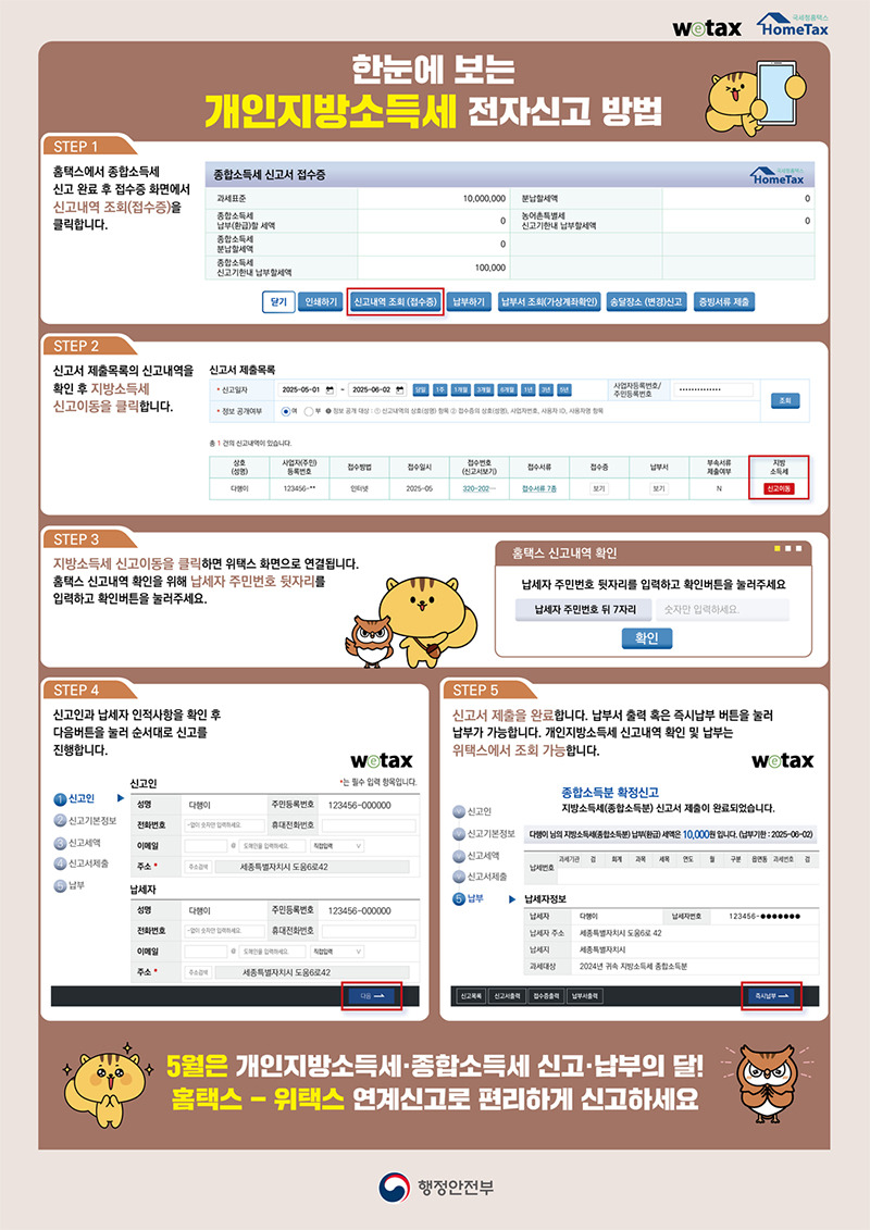 매년 5월은 종합소득세 및 개인지방소득세를 신고·납부하는 중요한 시기입니다.특히 국세인 종합소득세를 홈택스에서 신고한 뒤,지방소득세까지 연계 전자신고를 완료해야 원스톱으로 납부할 수 있어 편리합니다. 더 나아가 이미 납부한 지방소득세 중 과납액이 발생했다면,별도의 서류 준비 없이 간단한 절차를 거쳐 환급받을 수 있습니다. 본 글에서는 전자신고 단계별 절차와 환급 신청 방법, 유의사항을 상세히 정리하여,5월 한 달 간 걱정 없는 신고·환급을 도와드립니다. 개인지방소득세 신고 방법개인지방소득세는 주민등록상 주소지 관할 지방자치단체(시·군·구)에 납부하는 세금으로,종합소득세의 10%에 해당합니다. 과거에는 위택스를 통해 별도로 신고했으나,2025년부터는 홈택스에서 종합소득세 신고를 완료한 뒤 ‘지방소득세 신고..